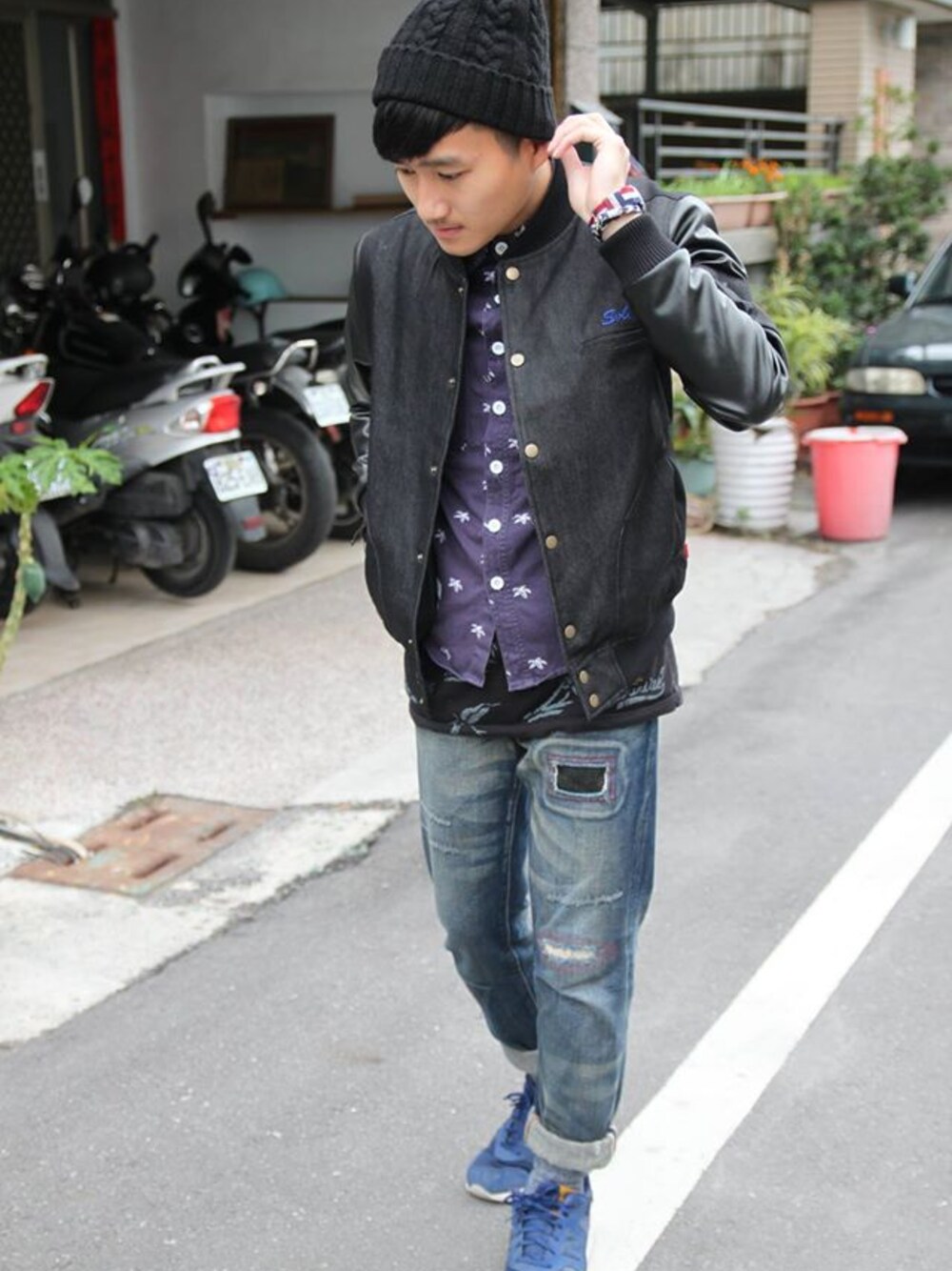 天氣日益轉涼,穿上屬於自己的冬天穿搭。 MA-1一直為不可或缺外套之一,而這件卻在材質上有所不同,表面使用牛仔布,袖子採用接皮,看起來更加有層次感以及成熟性,內裡選用滿版x滿版做結合,利用顏色的落差雖然都是滿版但不撩亂又有強烈層次性。 而戴上一頂素面毛帽,增添冬天氣息。
