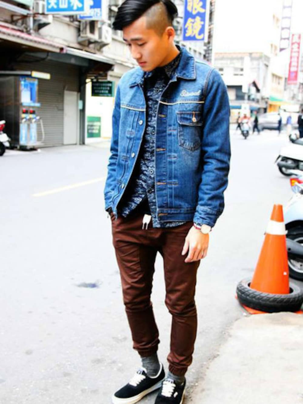 想呈現的是一種簡單俐落不複雜的街頭感。 利用刷色牛仔外套為外搭,內搭迷彩襯衫增加重點性並與下身麻花灰襪做對稱,最後搭上近期非常火紅的REMIX X VANS聯名鞋款,街頭感十足。