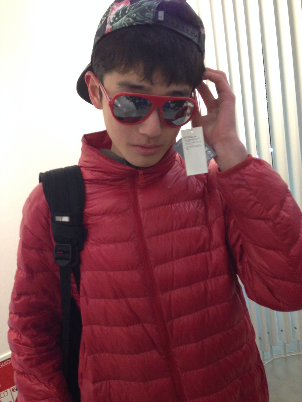 赤をメインにコーディネートし、スナップバックのキャップで外してみました!