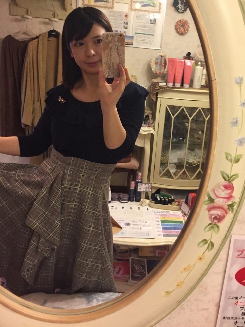 アプワイザーリッシェ、ネイビーのニットに、フリルがついたグランチェックのスカートを合わせました。シンプル過ぎずちょっと甘さを加えています。