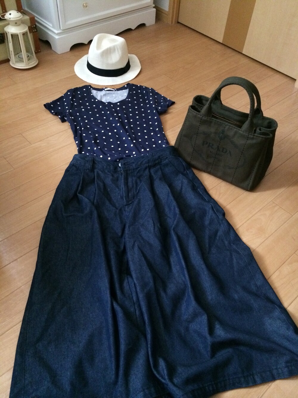 ちょっと寒いけど‥ ネイビーのドットTシャツに GUのデニムガウチョ(*´ー`*) 白ハットに秋っぽく⁇カーキバック☆