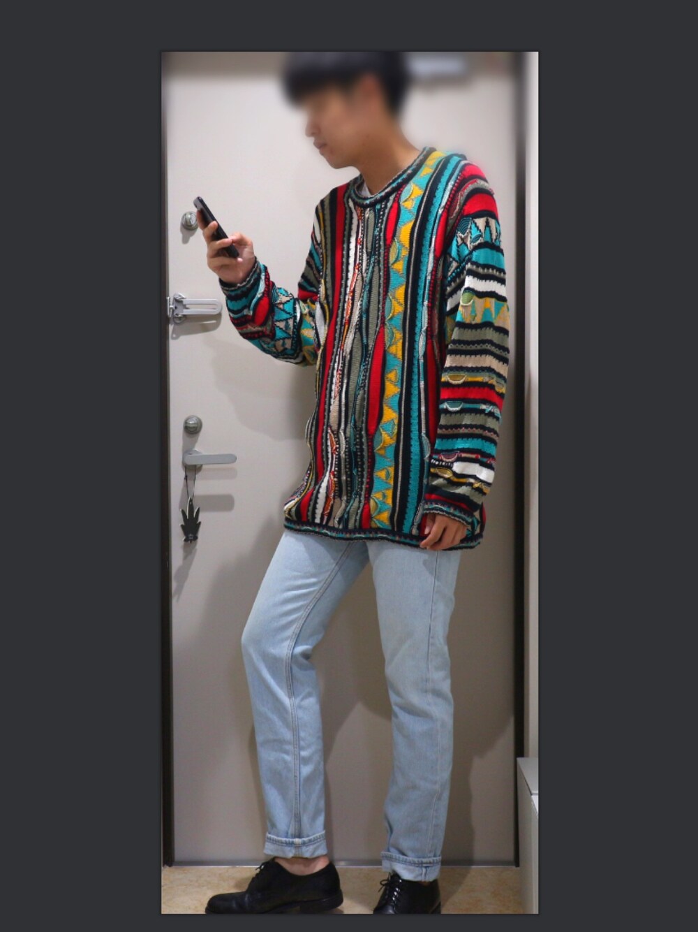 その他のニット/セーター、ブルー系のデニムパンツを着用したメンズの秋コーディネートの1枚目の写真