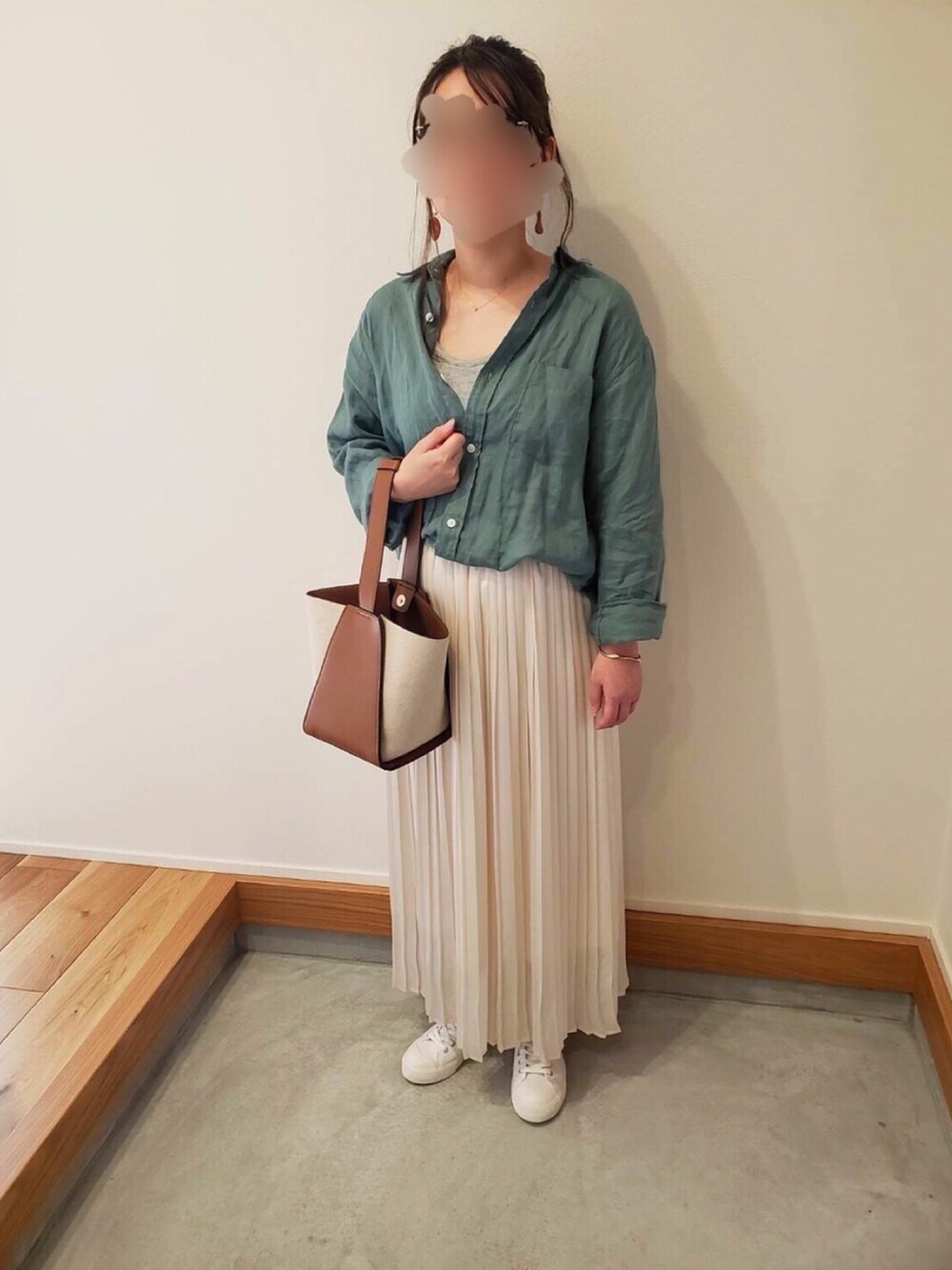 リネンシャツを襟抜きに着て、無印のタンクトップをちらりと。 小物をブラウン系でまとめて、全体的にアースカラーに❤︎