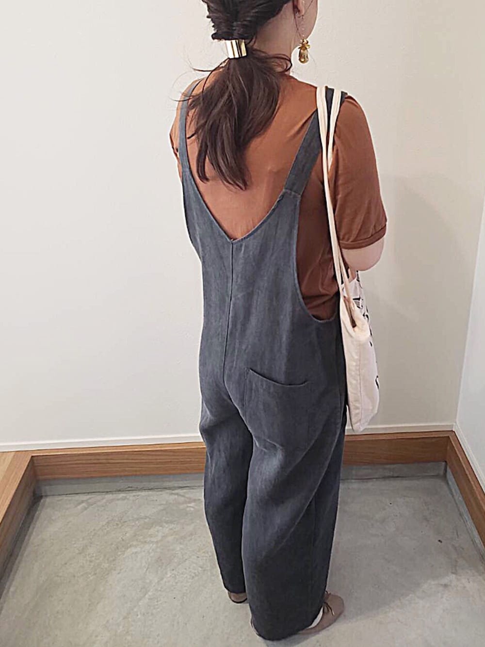 お久しぶりの投稿です🤦🏻♀️ 今日も見ていただきありがとうございます🙇♀️ 早く秋服着たいのに、まだまだ暑い😵💦ので、この夏大活躍したリネンサロペットを🕺後ろ姿のデザインも可愛いのです🤗