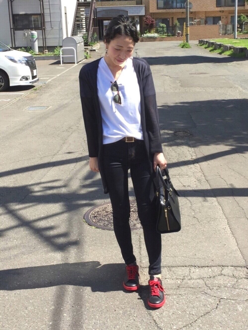 ご覧いただきありがとうございます😊💓 誕生日プレゼントのmyスタンスミス なんか勿体なくて履いてなくて←😂笑 今日がデビューです。 大好きなAcid Black Cherryのイメージカラーの赤×黒♡ これ履くだけでモノトーンコーデのポイントになるからこれからの季節活躍しそう✨ adidasとLEPSIMのドラフトに参加させていただきますm(__)m 札幌珍しく、朝9時から半袖でもいける‼️ さてさて、これから南下します✈️