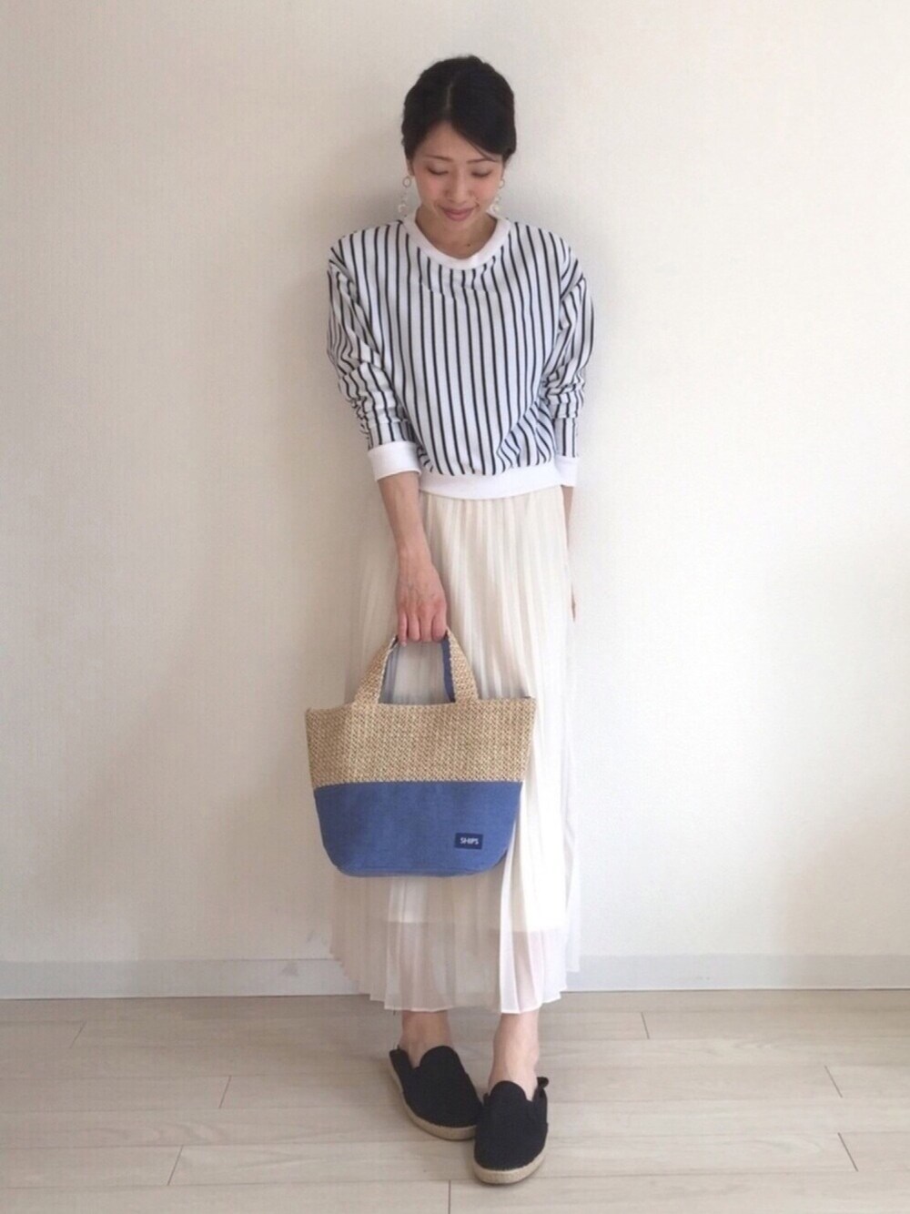 ご覧いただきありがとうございます😊💓 縦縞×シフォンプリーツスカート かごバッグとエスパドリーユで 夏っぽく涼しげに✨ 昨日家に帰ってから あ!買い忘れた😂 家帰ったら まず脱いで笑 部屋着に着替えます。 脚に開放感が欲しいんですよね😂笑 なので雰囲気を変えて再び買い物へ出かけました✨ さっきと同じ人だと思われないようにね‼️
