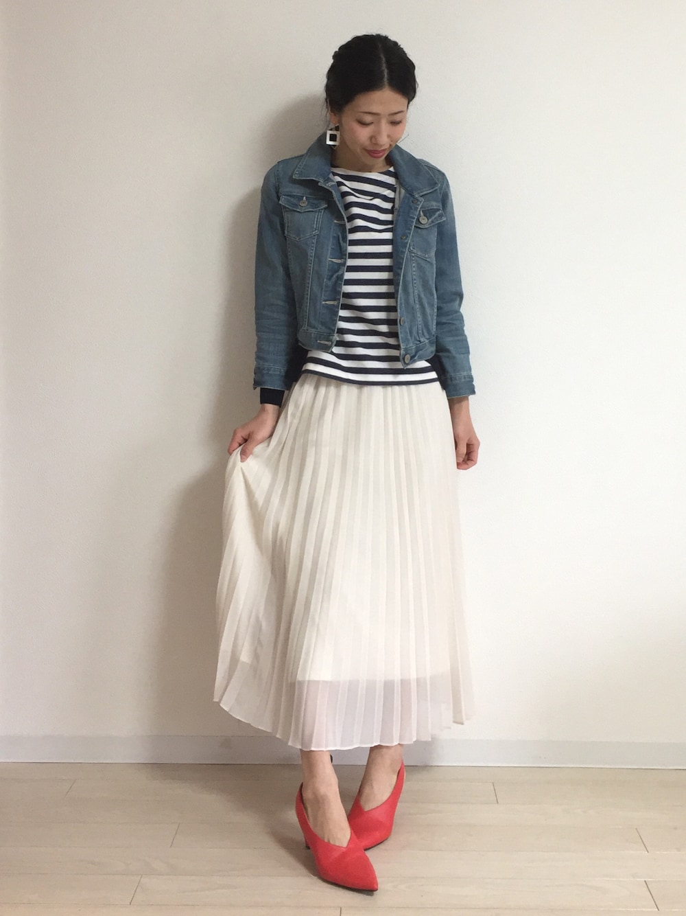 ご覧いただきありがとうございます😊💓 薄色デニジャケに朱色のパンプス合わせました♡ ピンク×薄色デニムの組合せが春夏っぽくて好きです☺️ でもね、 私が休みだと〜 いつの日も〜 雨〜〜〜😂♫ 雨に負けずお出かけしてきます🚘