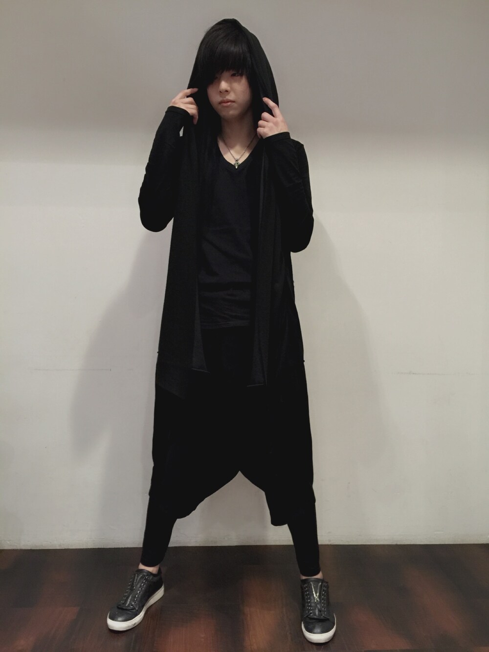 カーディガンにワイドサルエルパンツで Aラインからのスニーカーの ブラックコーデです ちなみに普段はフードかぶりませんww