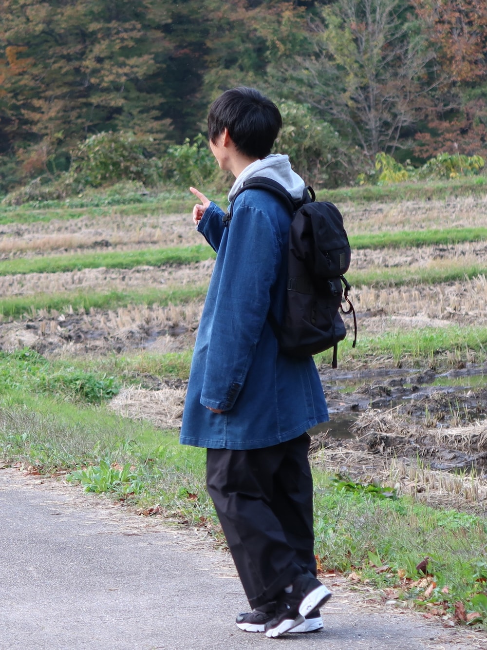 デニムコート×ワイドパンツ。