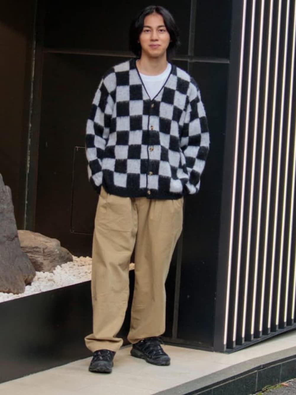 ベージュのパンツと合わせたシンプルなコーディネート。 カーディガンはゆったりとしたサイズ感で男女問わずお使い頂けるアイテムです!