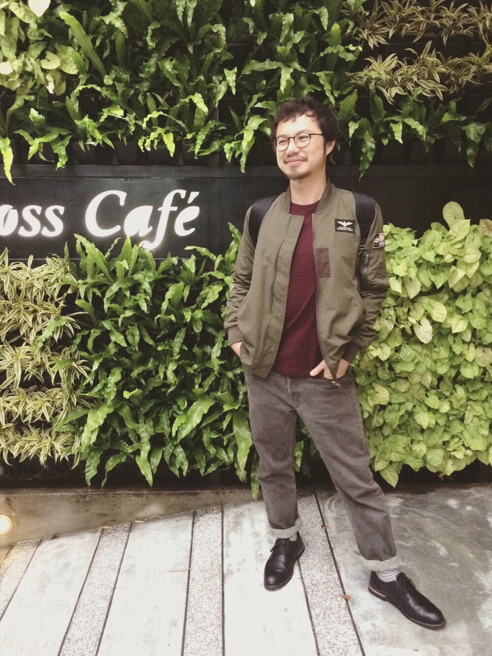 窄版MA-1搭配較寬鬆灰色501 軍綠搭配酒紅色內T 選擇皮鞋增加軍裝感