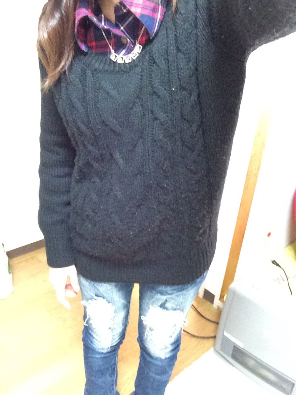 今日は娘の9ヶ月検診でした😋 歩いて産婦人科まで行くので歩きやすく、寒さ対策🍃としてニットを着ました😄 娘さんは、産婦人科着いて診断始まったそばから泣きわめく…大変でした… このスタイルは泣きわめく我が子を抱いてなだめてたら、ちょっと暑かったです…😥