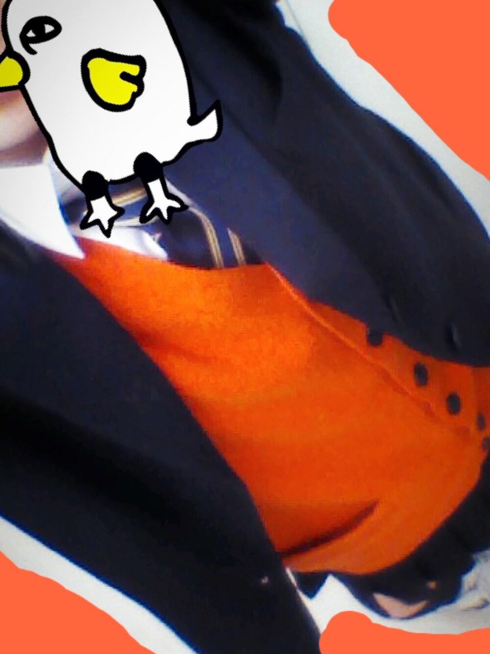 オレンジ系のカーディガン/ボレロを着用したレディースの春コーディネートの1枚目の写真