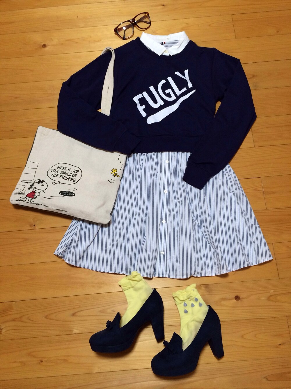 シャツワンピ:GU ソックス:tutuanna カバン:mini付録 あした何来てこっかなーって考えてて 出来上がったコーデです。笑 パステルブルーのストライプにパステルイエローで、爽やか〜にしてみました(^^)