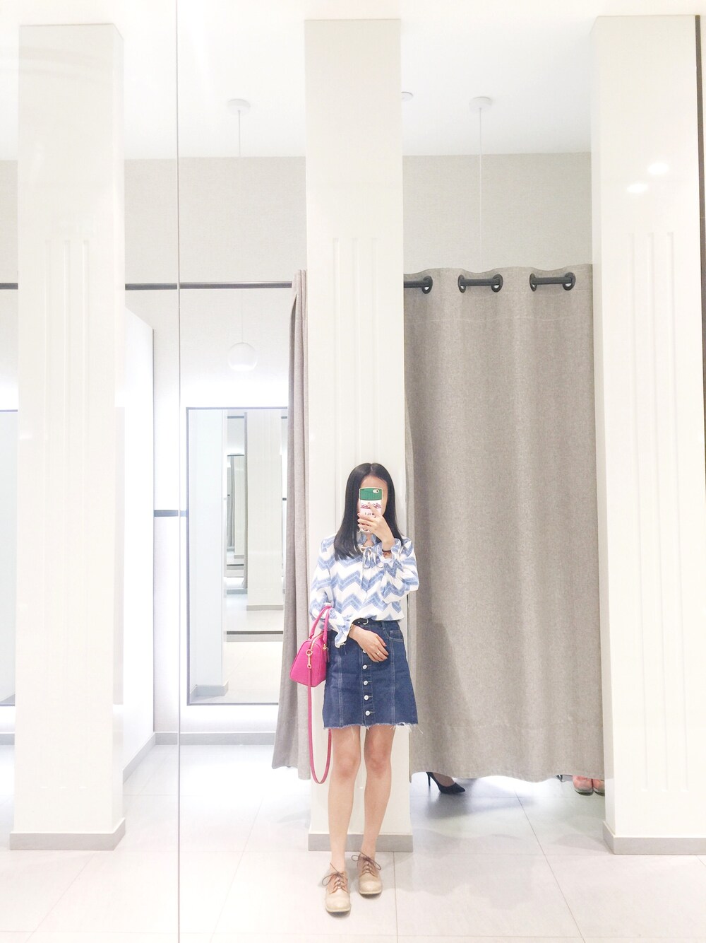 ブルー系のデニムスカート、ピンク系のボストンバッグを着用したレディースの春コーディネートの1枚目の写真