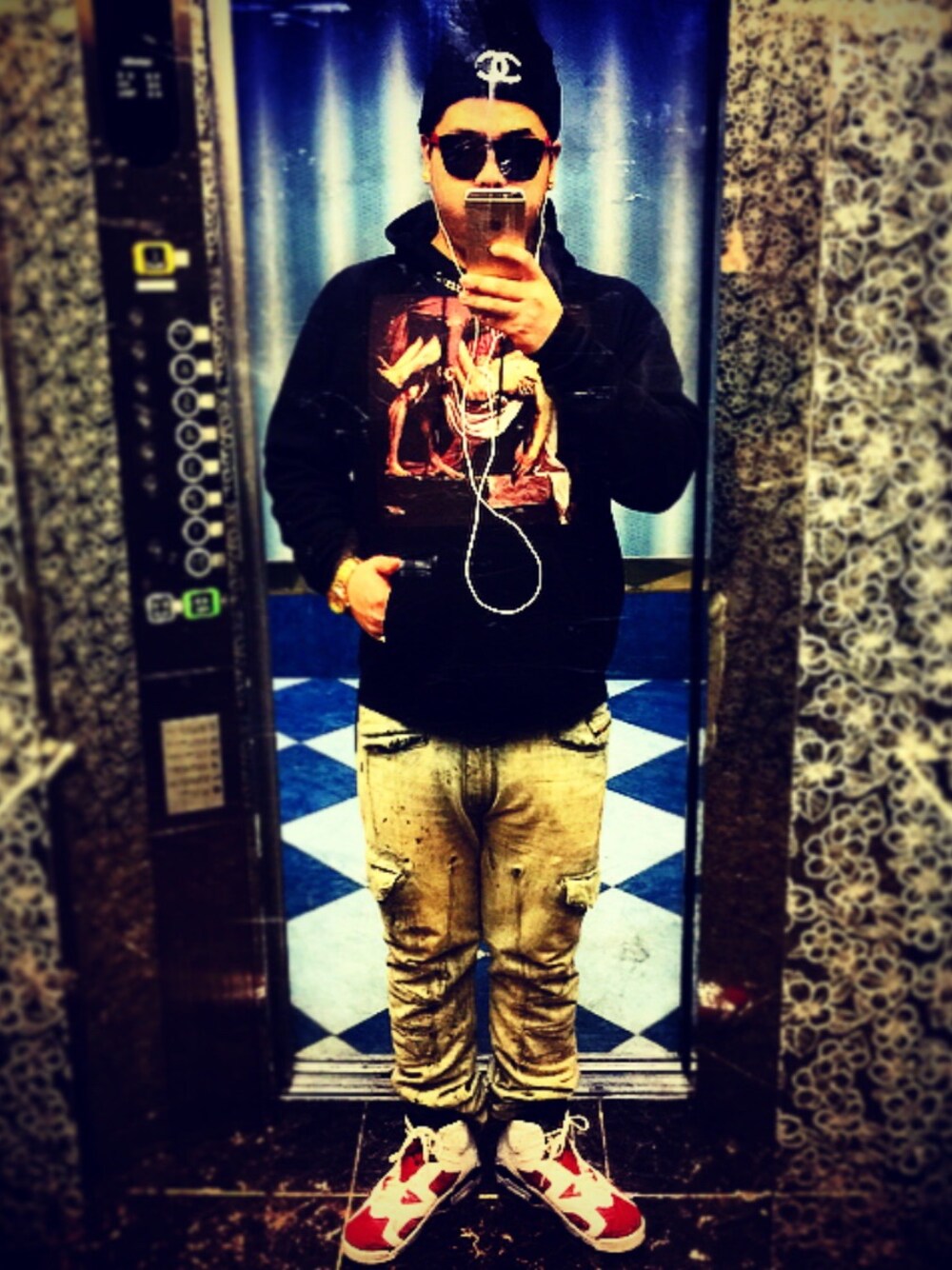 ブラック系のパーカーを着用したメンズの秋コーディネートの1枚目の写真