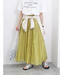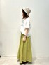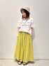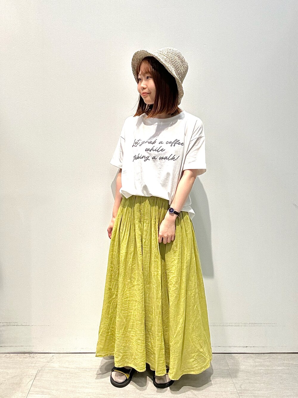 イエローが目を惹くスカートを主役に、夏らしく華やかなコーデに✨ グレーの帽子が涼しげでお気に入りです!