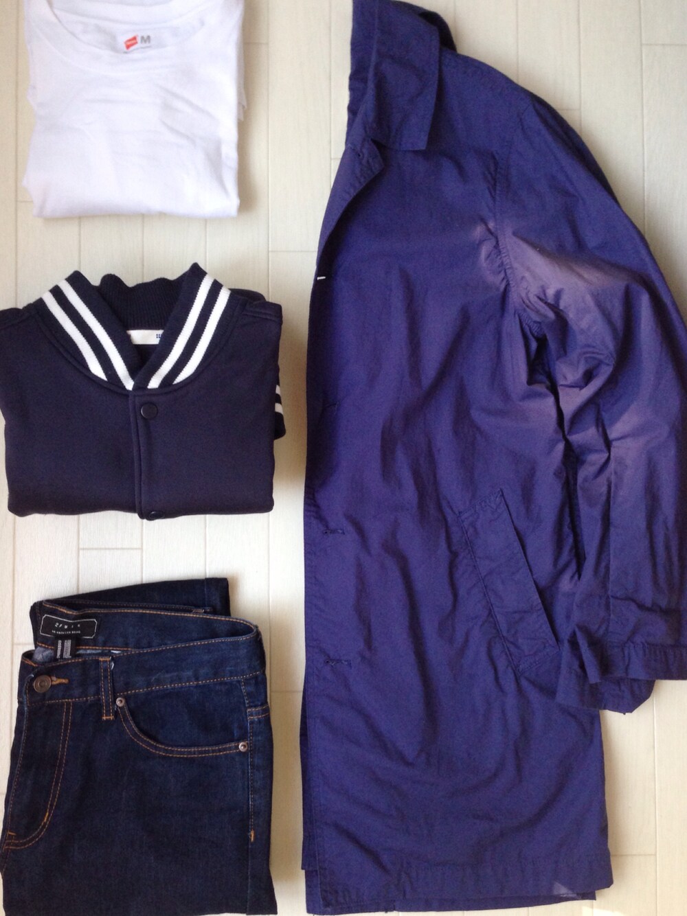 バックナンバーのシャツコート二千円ぐらいで、相当薄い。ぺらっぺら! グローバルワークのローファー。 白ソックスでデニムはロールアップ ダブルアウター好き。