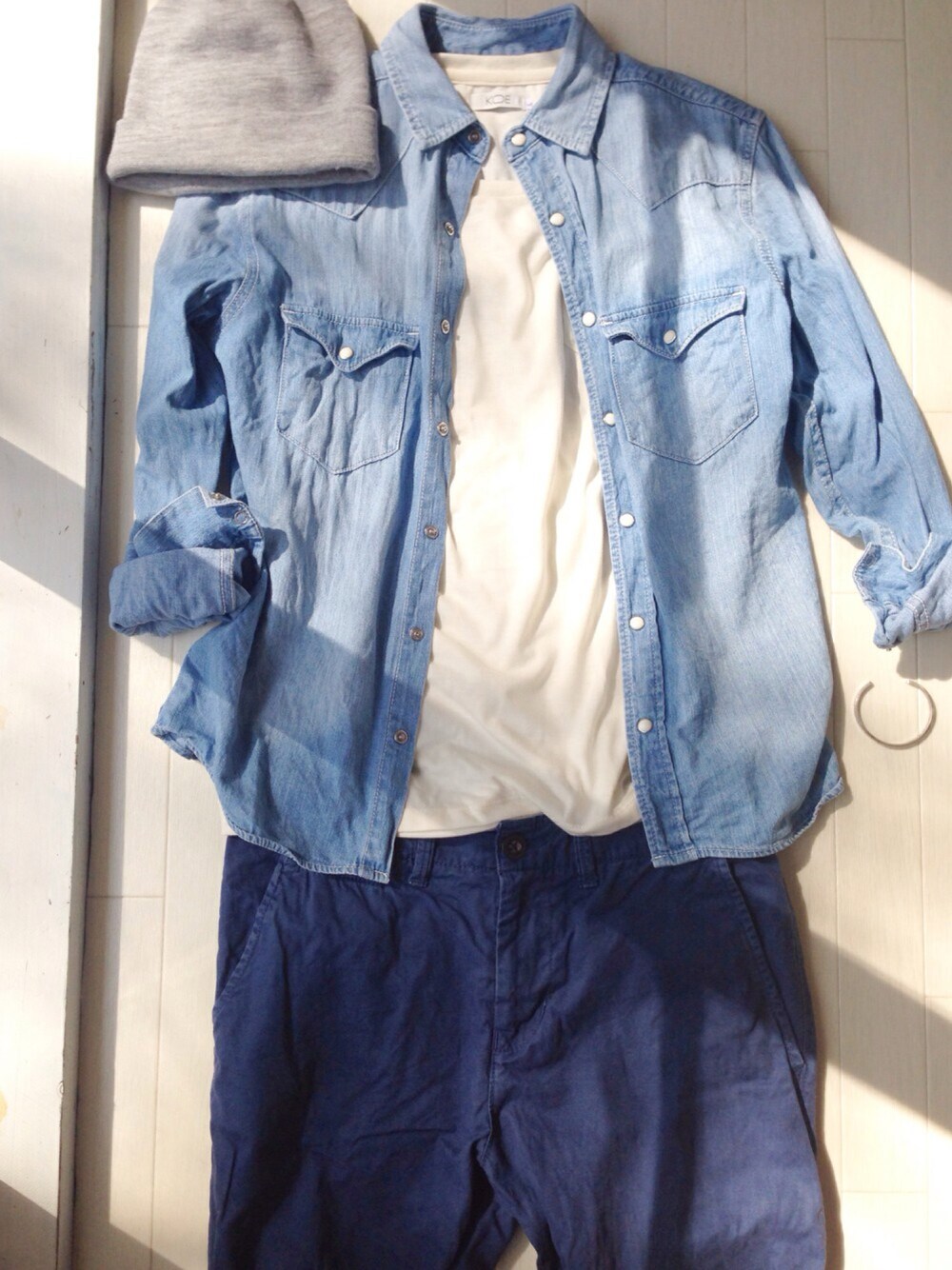アメリカンイーグルのパンツ、色あせたネイビーって感じで気に入ってる。 足太いから短足に見えるのが 残念なんだよなぁ… ロールアップして履こう。 中に白Tを合わせないでクリーム色にしたからなんかいつもと違うってなってるかな〜なってたらいいなぁ〜 あー海行きたいなぁ〜海〜🏄 あそうだあとシルバーのバングル。 シンプルで気に入ってる。 この格好、いつしかのFineの格好を参考にしてる。あれ、オーシャンズだったかな?忘れた。
