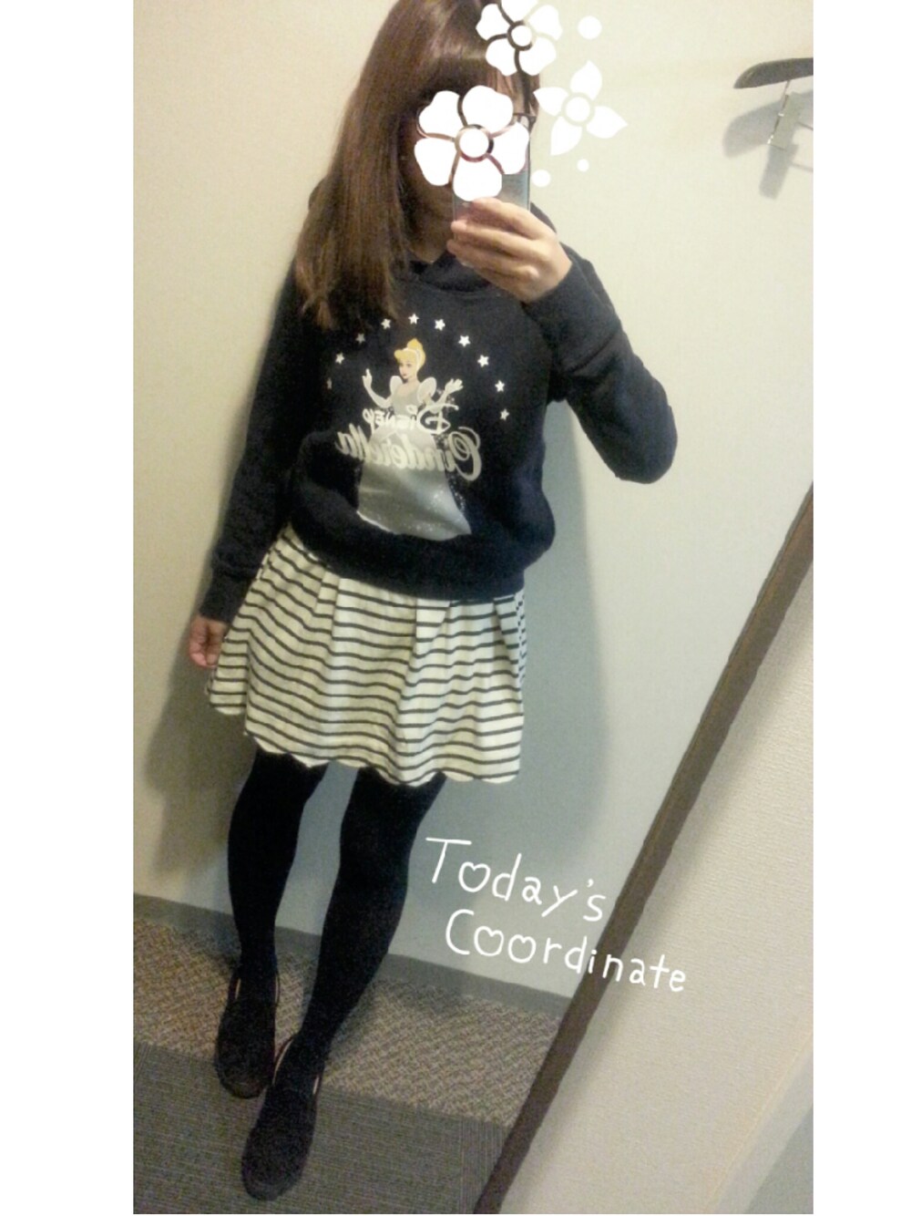 ユニクロで一目惚れしてしまった シンデレラのパーカー:) 今日はさむかったので、厚手の生地であったかく。 昨日遊びに行ったディズニーランド内にも着てるひとがちらほら