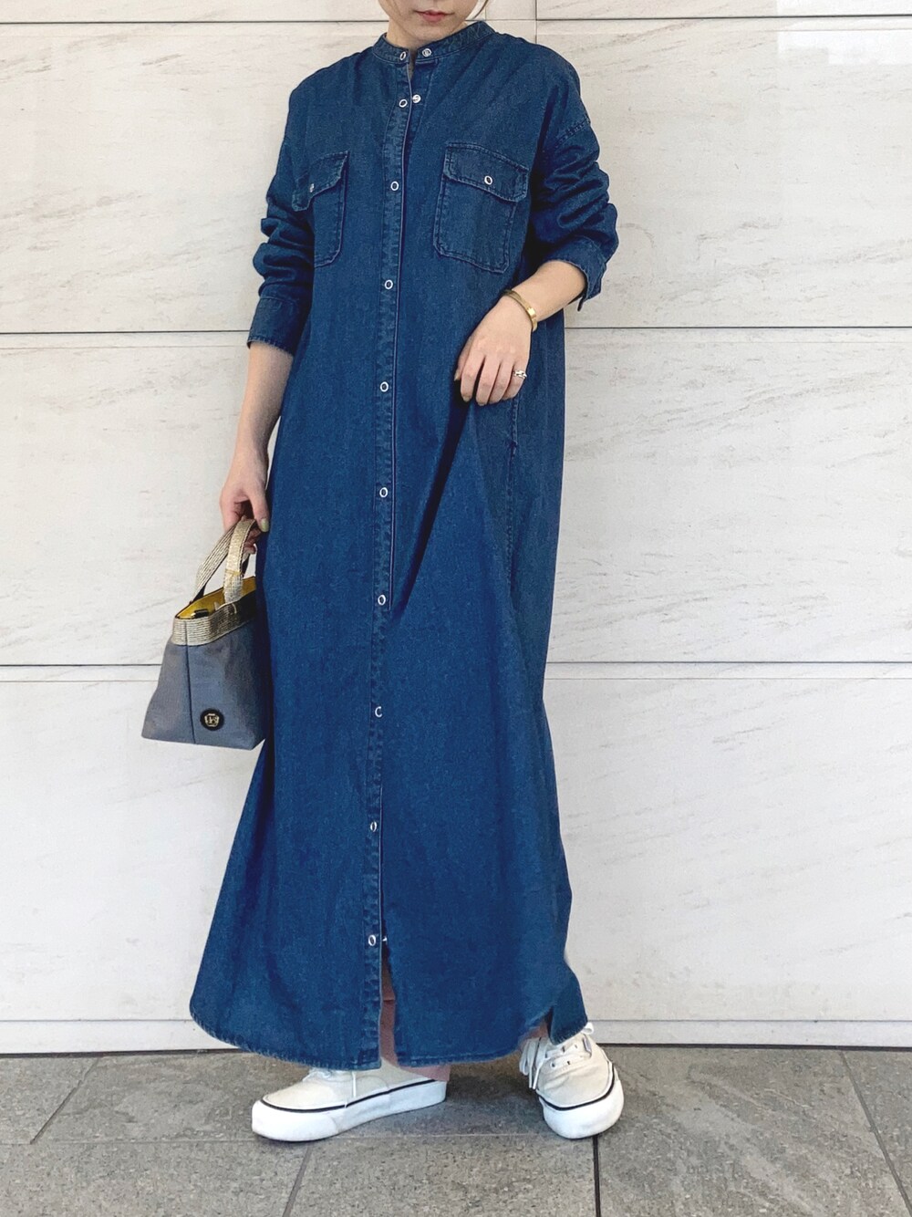 アコのワンピース「デニムノーカラーシャツワンピース」を使ったコーディネート