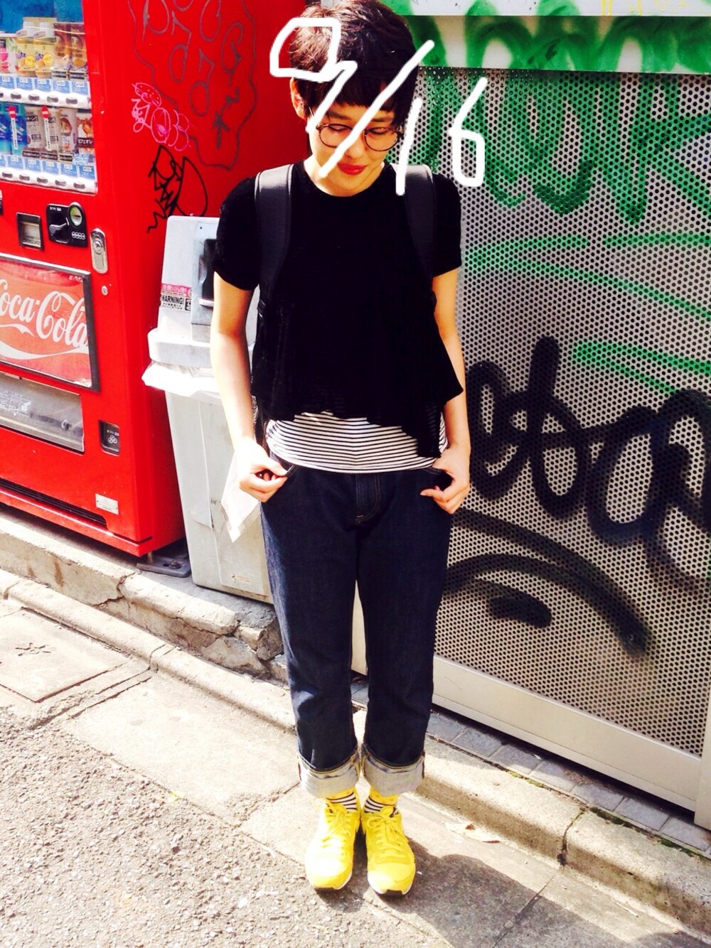 こんにちわ! 今日は久しぶりに日差しが つよかったですね 秋が恋しいので ベルベット素材のトップスを✌︎ 古着のコムデギャルソンです インナーのボーダーと 靴下のボーダーを合わせて ◎ (顔がにやにやしてるのびたくん)