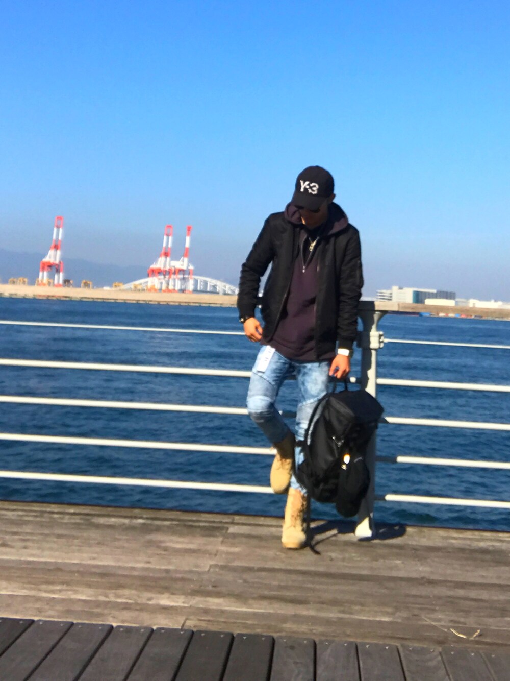 こんちは! 今日は、お出掛け日和! 快晴なので海辺の所で写メ撮ってもらいました! 昨日と違う服装でぇす👍🏻 y-3 のキャップ久々!