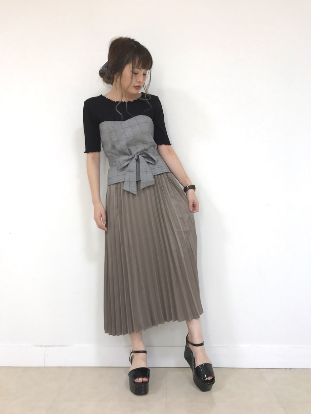 👀ありがとうございます! 今日はいつもより大人っぽくしてみました✨ グレンチェックのビスチェは 巻くタイプなので ウエストがスッキリ見えるし 足長効果もでますよね✌🏻✌🏻 そしてプリーツスカートのお色が好き😍 写真じゃわかりにくいですが 素材がテロテロキラキラしててそれも好き😍 いつもイイね・saveありがとうございます! ぜひFollowもして頂けたらうれしいです!