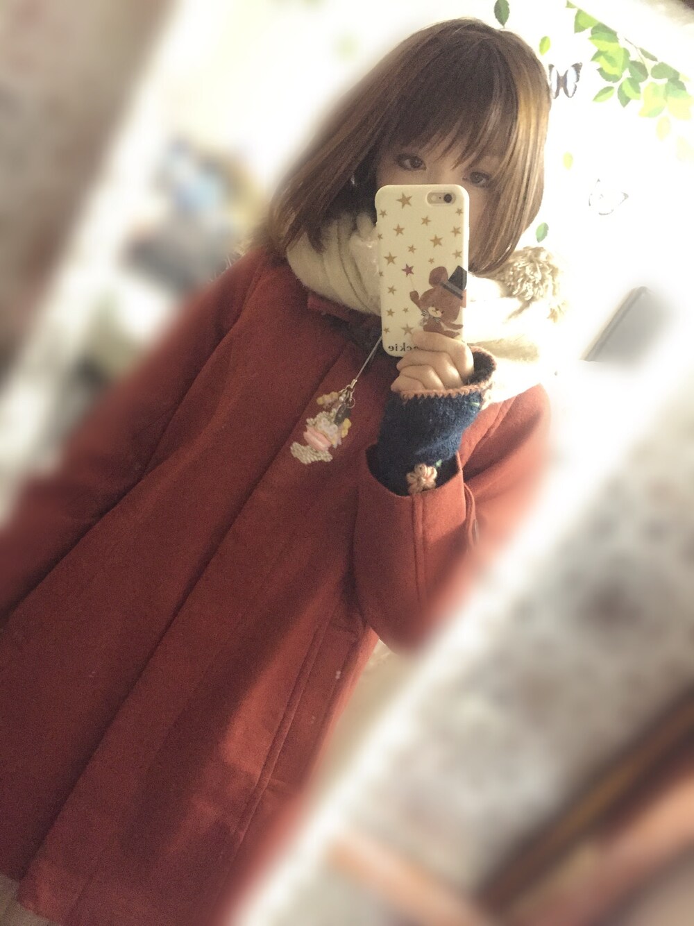 今年お気に入りのオレンジのAラインコートです(*≧∀≦*) 丈が長くて暖かい♪♪ アームウォーマーもお花の刺繍があってお気に入りで暖かいです🍀