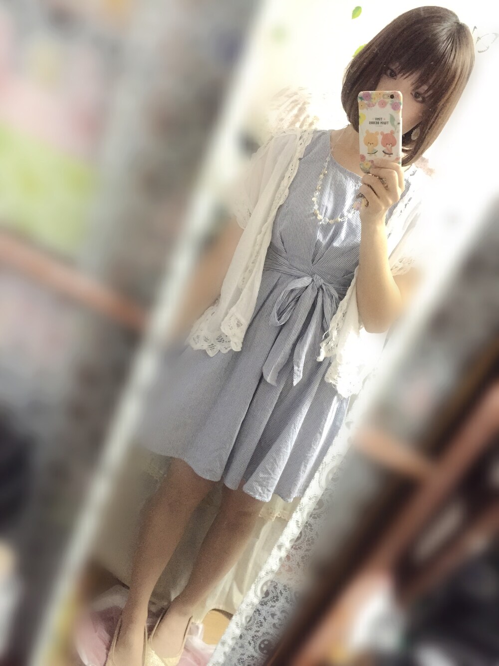 昨日のコーデです(≧◡≦) 去年買ったワンピース出てきたので着てみました✨ 袖がノースリーブっぽい感じなので カーディガンで隠しました(*≧艸≦)(笑) 腕プニプニすぎてやばいんですよね(੭;´ ꒫`)੭ カーディガンは去年古着屋さんで買いました✨