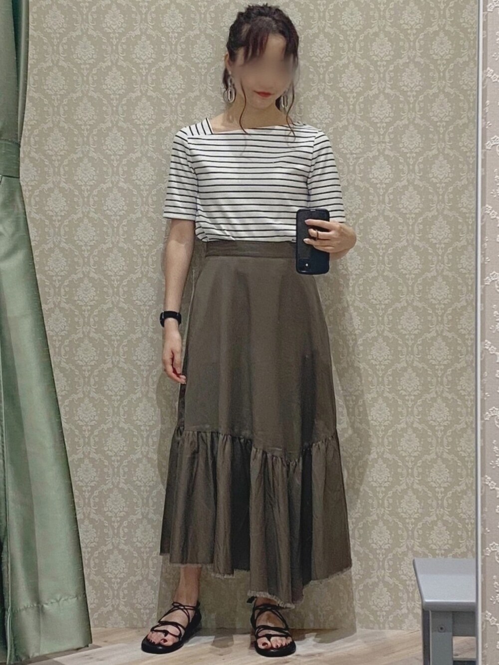 アシメ×アシメ スカートは長さに変化があって足首が見えるから、細見えします👏🏻 トップスは首元広すぎなくて着やすい👏🏻
