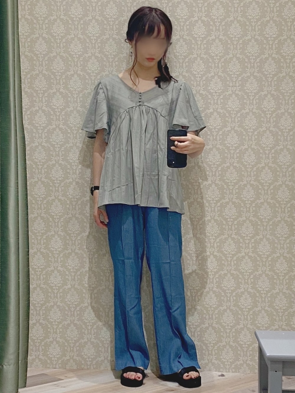 淡いミントカラーのブラウスは胸下切り替えでスタイルアップ👏🏻 袖が生地たっぷりのフレアスリーブだから腕細見えがすごいです👀