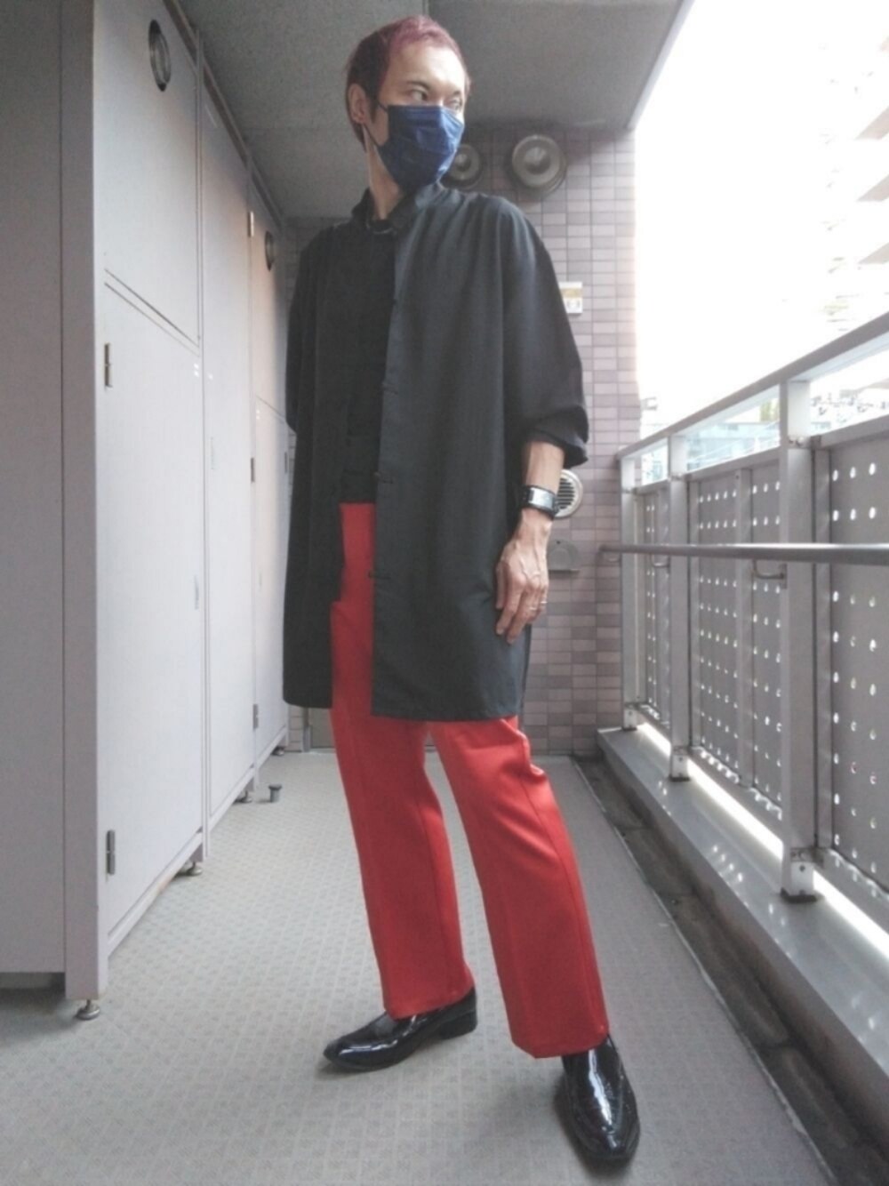こんにちは、エースです。 ご覧いただき、ありがとうございます。 また、いつも沢山のフォロー/いいね!/お気に入り登録にも感謝御礼です。 投稿No.81 カラーパンツコーデ パンツは、WEGOさんの「セミフレア カラースラックス」のオレンジです。写真ですとレッドに見えるくらい鮮やかなオレンジになっています。 ここまで色のインパクトがあると、全体的に抑えたカラーコーデで十分かなと。でも、普通じゃつまらないので、少々チョイスに工夫を。 黒Tシャツインナーに、トップスはMinoriTYさんの「メンズ長袖ビッグシルエットノーカラーチャイナシャツ」を羽織りとして合わせました。 シャツとしてはロング丈ですが、コート的に見るとミドル丈なので、パンツのカラーインパクトを上手い感じでカバーしてくれます。 最後に足元ですが、ドレスシューズを合わせています。 ブラックですがエナメルにしているのは、カラーインパクトをカバーではなく引き立たせるのが目的です。 オレンジのカラーパンツを自分なりに消化できたかなと思いますが、いかがでしょうか? 今年は様々なカラーのパンツがトレンドになっていますが、2021A/Wもまだ続きそうで、楽しいですね。 またよろしくお願いします!