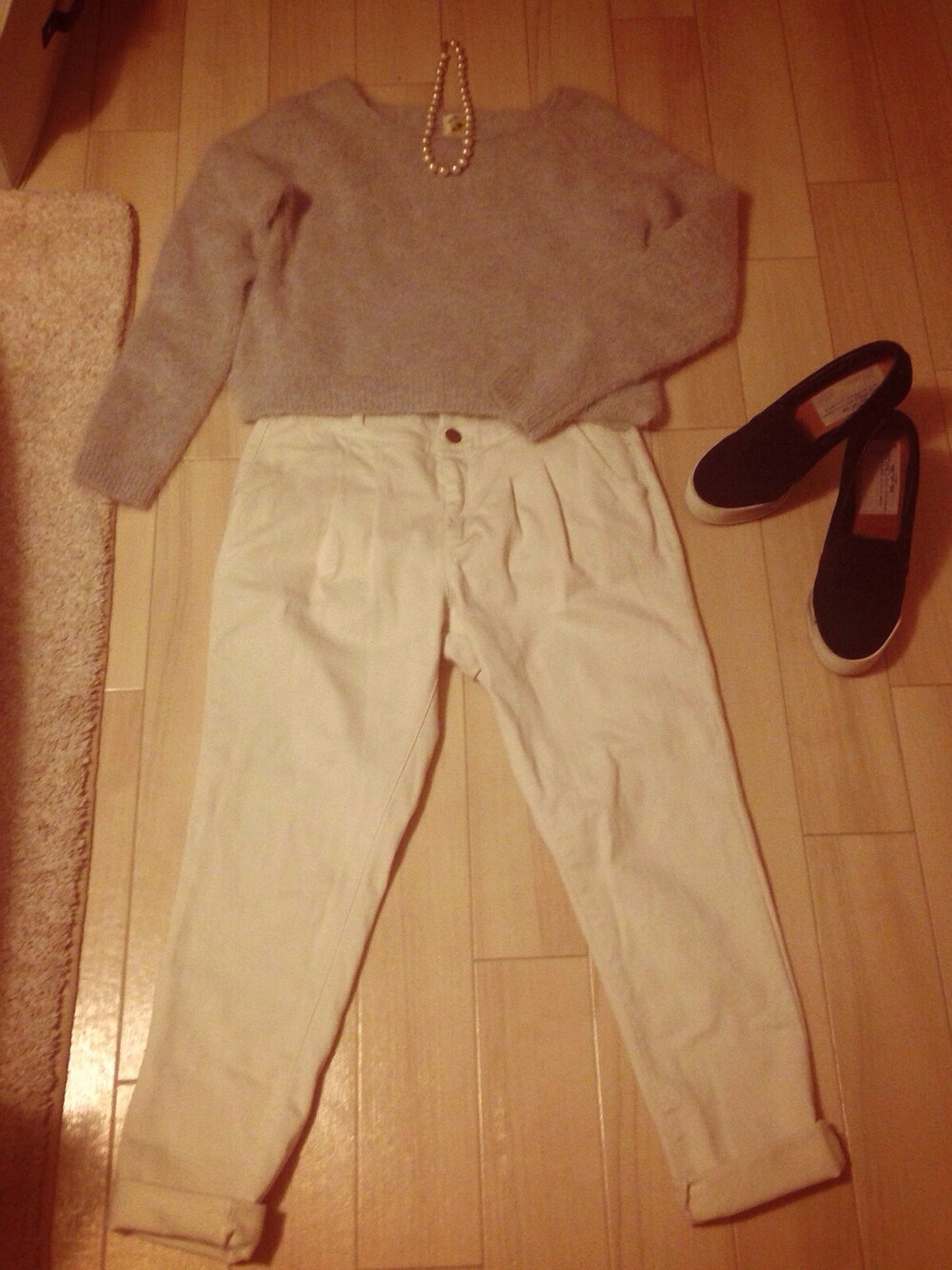 ライトグレーのショートニットに 白のハイウエストのパンツを 合わせました☻ 足元はお気に入りのピッピの パンプス♪