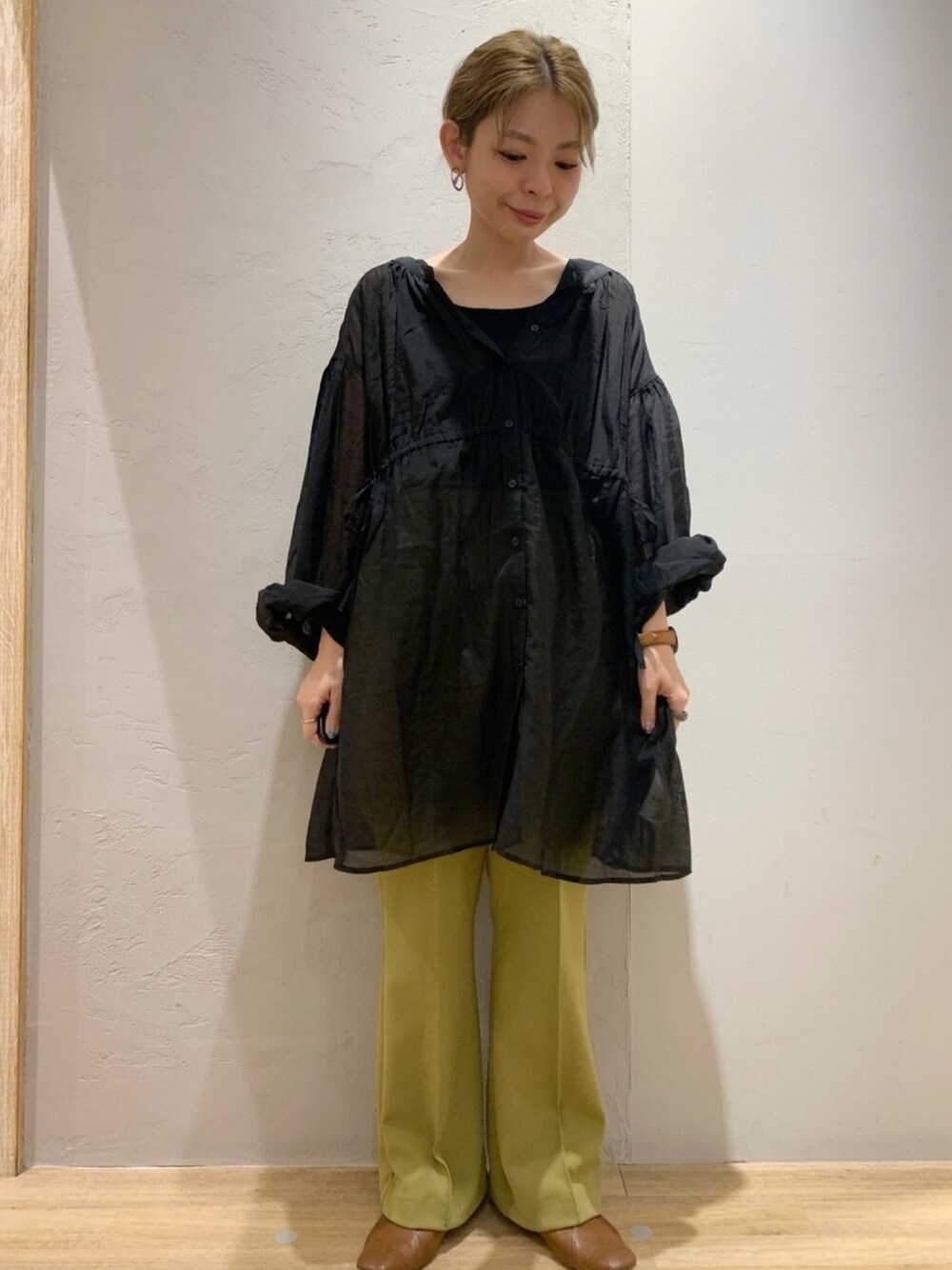 かわいいかわいいブラウスが入荷しました! シアー素材なのでとても今年らしく、 またウエストが絞れる所やバックリボンがアクセントになっています。 シアー素材にバックリボンやウエストマークなど、、デザインだけ聞くと可愛すぎる印象がありますよね。 今回の様にカラーパンツやデニムと合わせてカジュアルダウン出来るので、甘めが苦手な私でも合わせ易いです。 またボタンを外して羽織にしても◎ 羽織る際にも絞りの強弱で表情が変えられるのでとてもおすすめです!