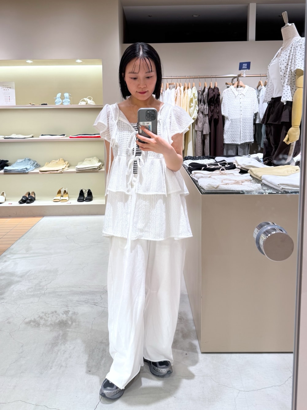 肩のフリルが二の腕カバーしてくれます✨️ スウェットパンツとボーダーのキャミで甘すぎないように気をつけてます!