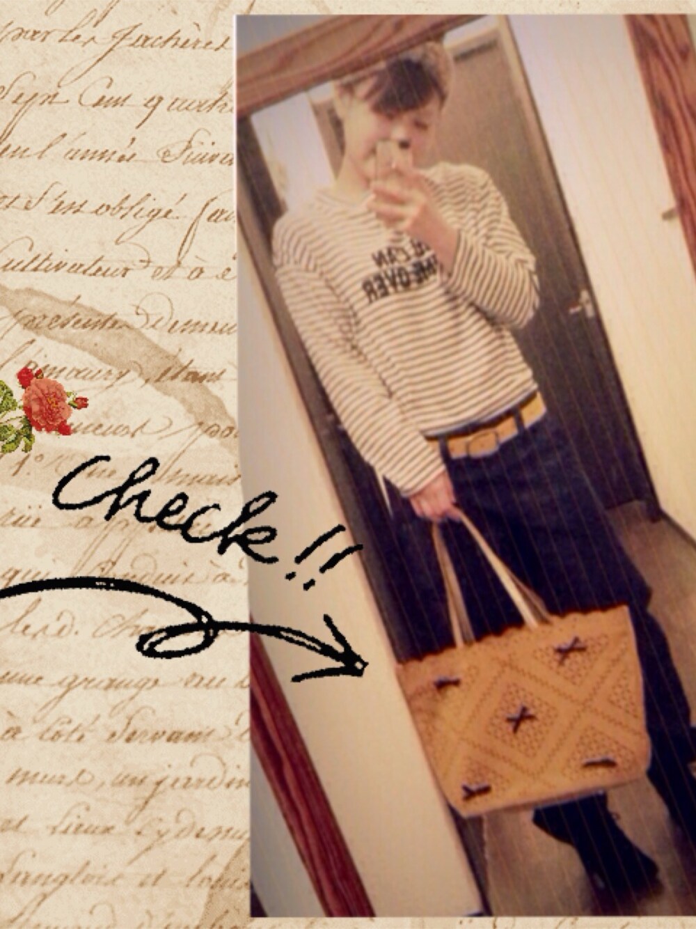 今回はバックか主役です。 passage mignon マスタード寄りのイエローカラーに ネイビーのリボンがとっても可愛くて一目惚れ。 ボーイズライクなコーデでも グッと女性らしくなるバックです。 パンツのだぼっと感がお気に入り。