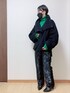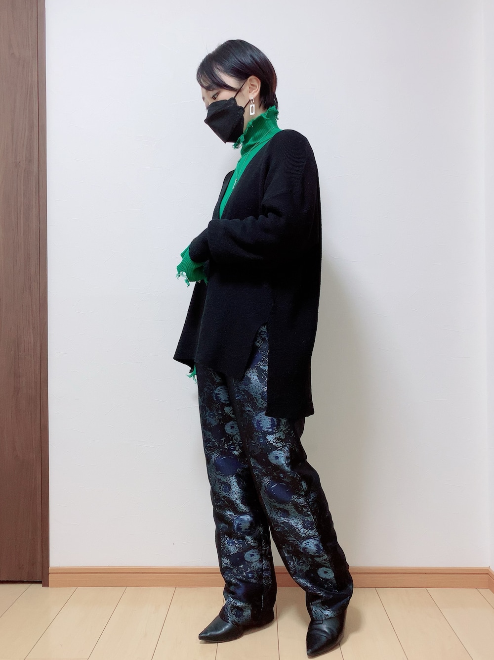 本日はジャガードパンツ😙 ブラックだけどギラギラ感あって良い✨ グリーンのダメージニットとざっくりVネックのあったかレイヤードとも相性良い〜🥰