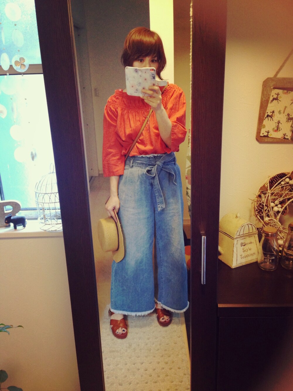このオフショルトップスかわいい😍 色が落ち着いたオレンジで、何よりオフショルしなくても可愛いのが嬉しい。
