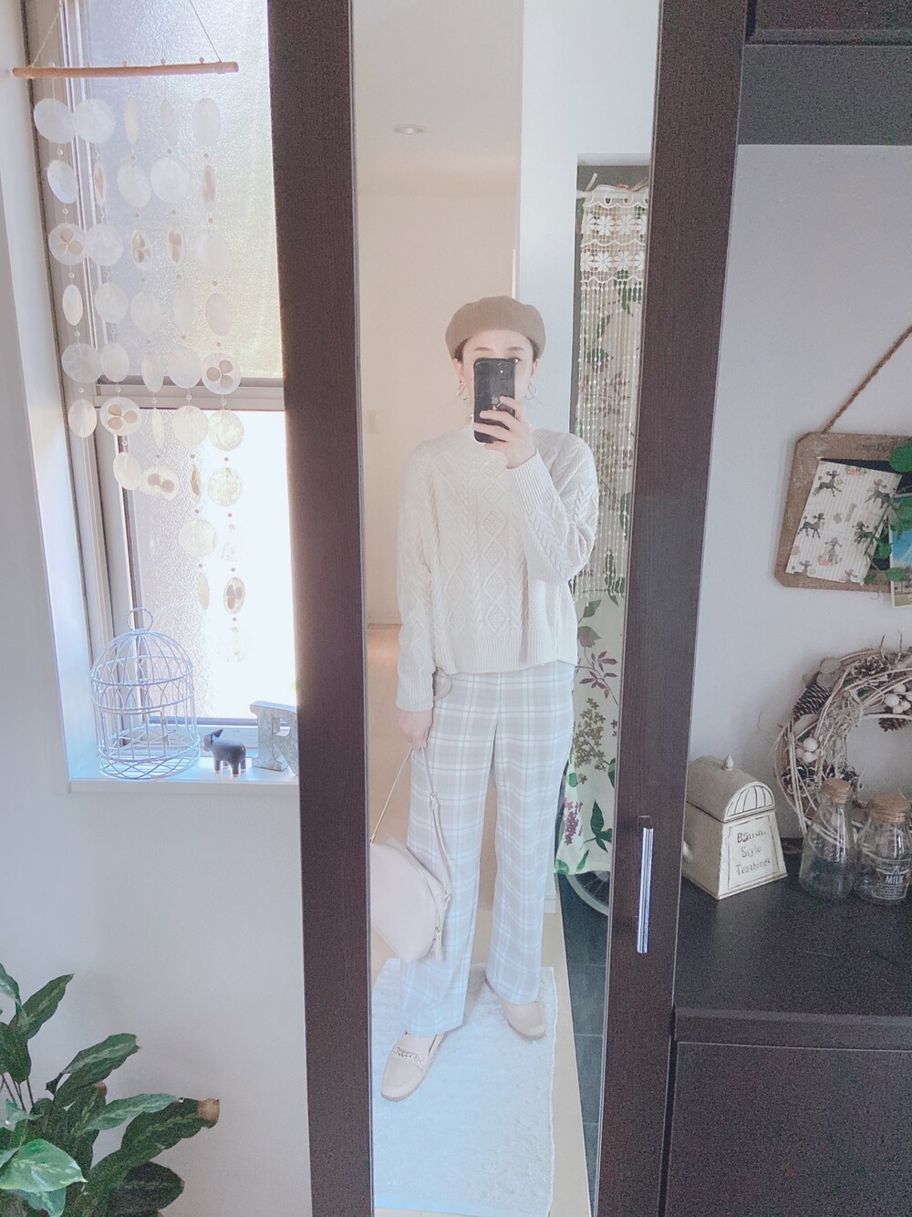 全身GU女現る ニット990円 パンツ990円 インナー790円 ピアス570円 ローファー2400円 ショルダーバッグ1900円 全身10,000円以内😃