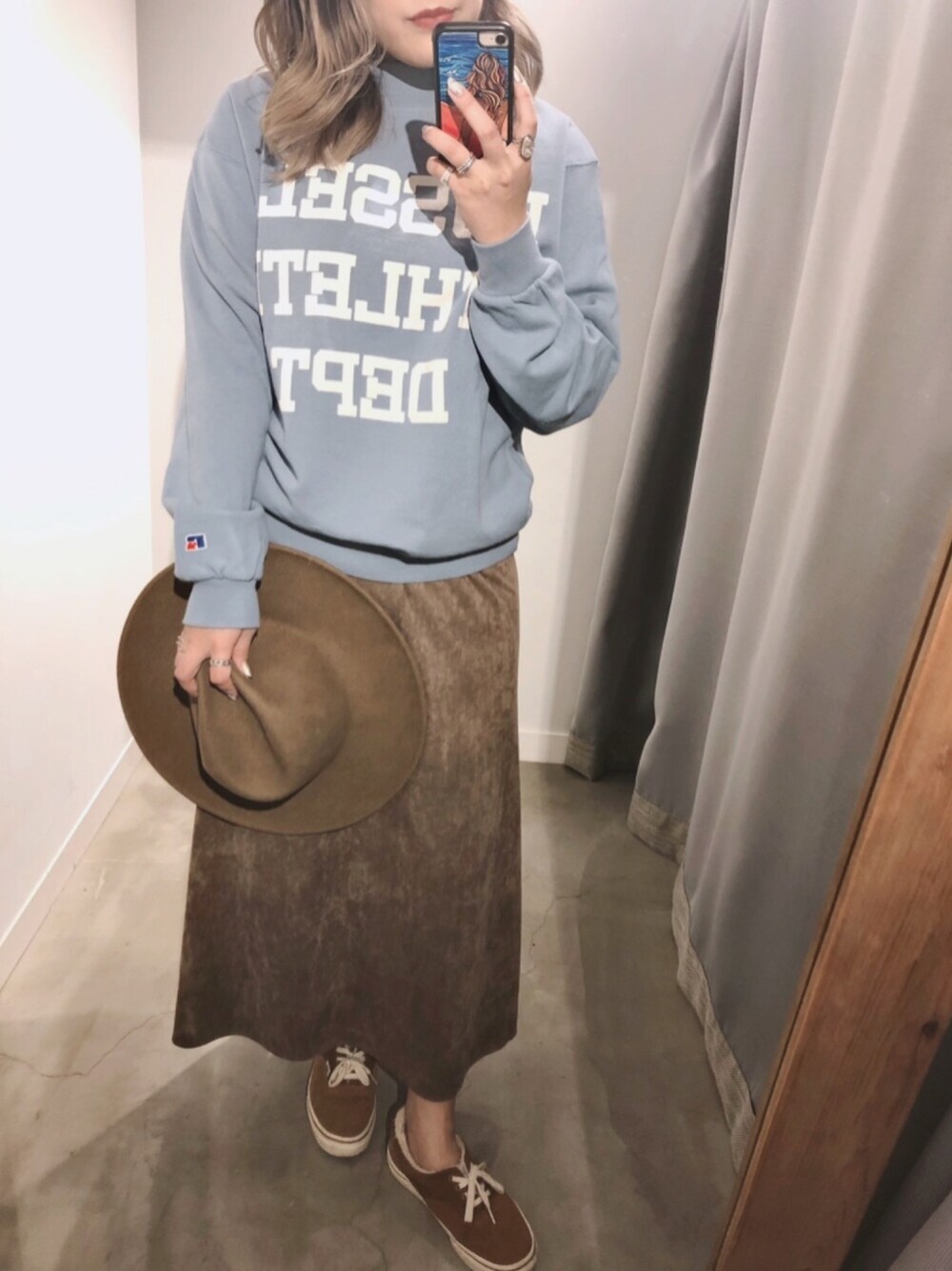 ご覧頂きありがとうございますっっ!♡ 珍しくスカートstyle♡ 春っぽくブルーのトレーナー合わせで♡ このrussell sweat茅ヶ崎店大人気と なっております! ブルーのカラー少量再入荷しております💓