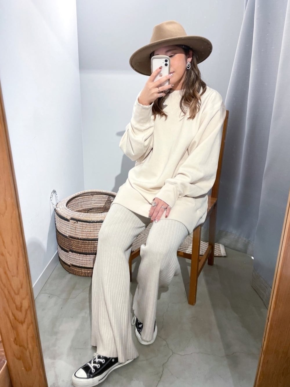 ご覧いただきありがとうございます!♡ ざっくりと楽ちんなトレーナーに ニットパンツでワンマイルコーデ♡ トレーナーは首元袖口に程よく ダメージ加工されていてUSED感が かわいい!🤭🙏🏽 まだまだ寒いけど春っぽく合わせたいので 明るいベージュカラーでニットパンツを!