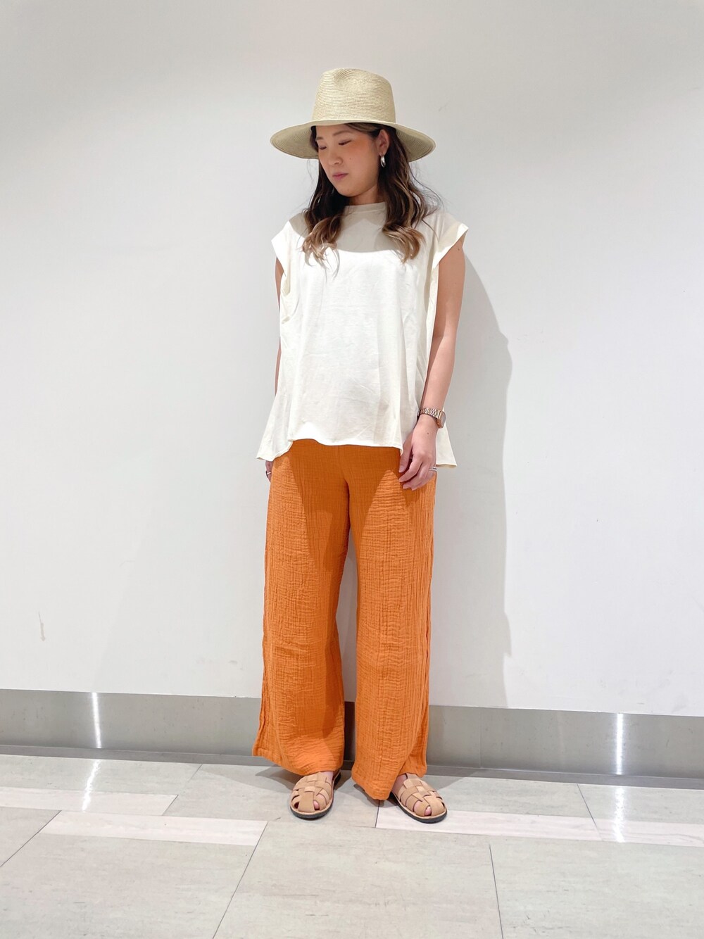 ご覧いただきありがとうございます!♡ さらっとした生地感と 着痩せ効果抜群のノースリーブが はいってきました🥺👌🏽 程よくゆったりしててタックで腕が すこ〜し隠れるので細見え♡♡ パンツは去年も大人気だった ガーゼシリーズ♡ 新色のオレンジをちょいすっ🍊 真夏でもめちゃめちゃ涼しくてオススメ!