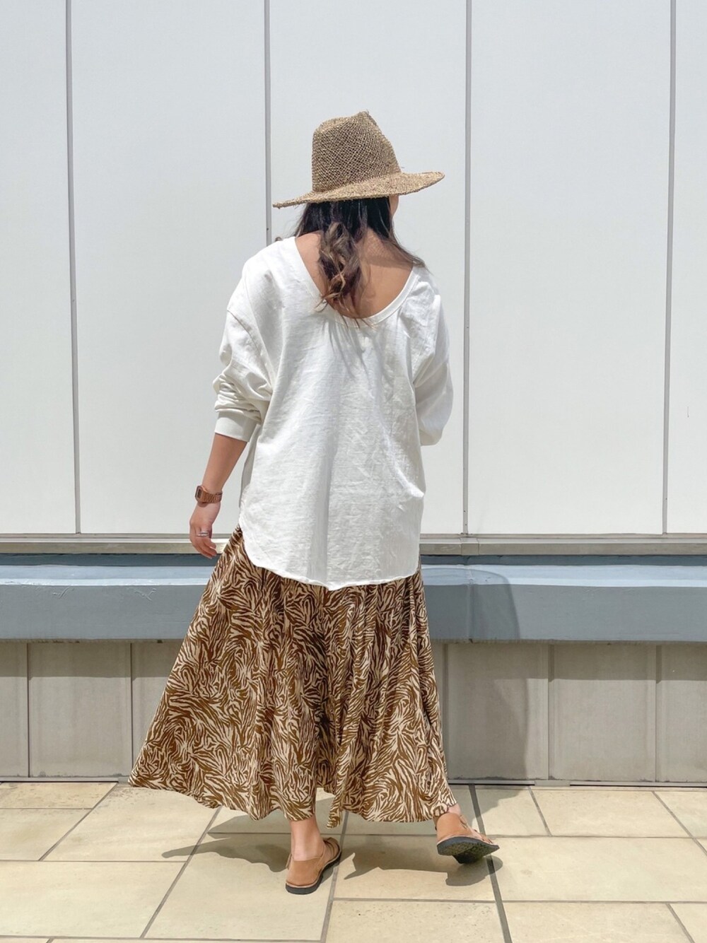 ご覧いただきありがとうございます!♡ サラサラした素材感で 夏でも涼しく履けそうなスカート🦓💕 広がりすぎず、ストンと落ちる形♡ 強くなりすぎないBEGを選んだよ🌼 トップスも去年からヘビロテしてる バックオープンのTシャツ♡
