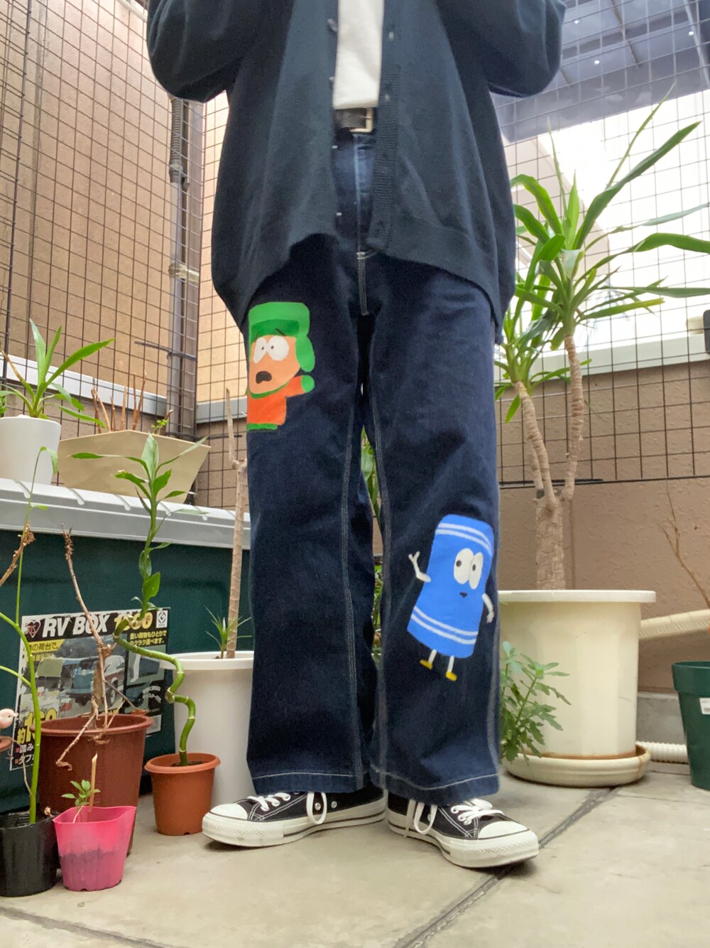 リメイクデニムコーデ🙌🏻💚 South Parkに登場するカイルとタオリーをGUのデニムパンツに描いて頂いた物です。 デニムを中心に撮ったのでローアングルだけど許してね🥹