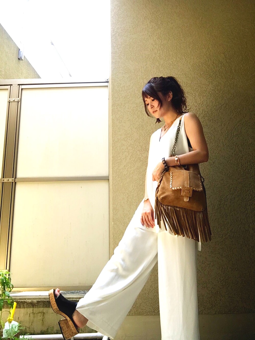 あっついので一足先に夏らしく真っ白!フリンジバッグとブレス、自分のブランドの羽根ピアスで軽いエスニックテイストに音楽