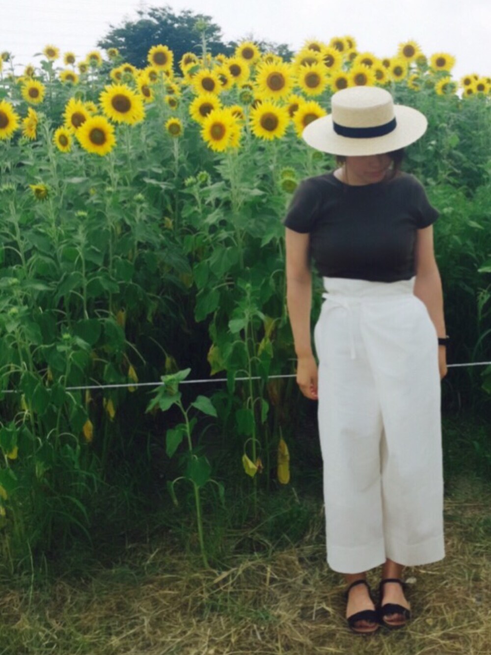 ヒマワリパワー🌻🌞 少し前に仲間入りしたハットとパンツ。 まっすぐなツバのラインがお気に入り👒 ハイウエストを履くとあらわになるずん胴…。 だけど履いちゃうという… 切実になんとかしたーい。