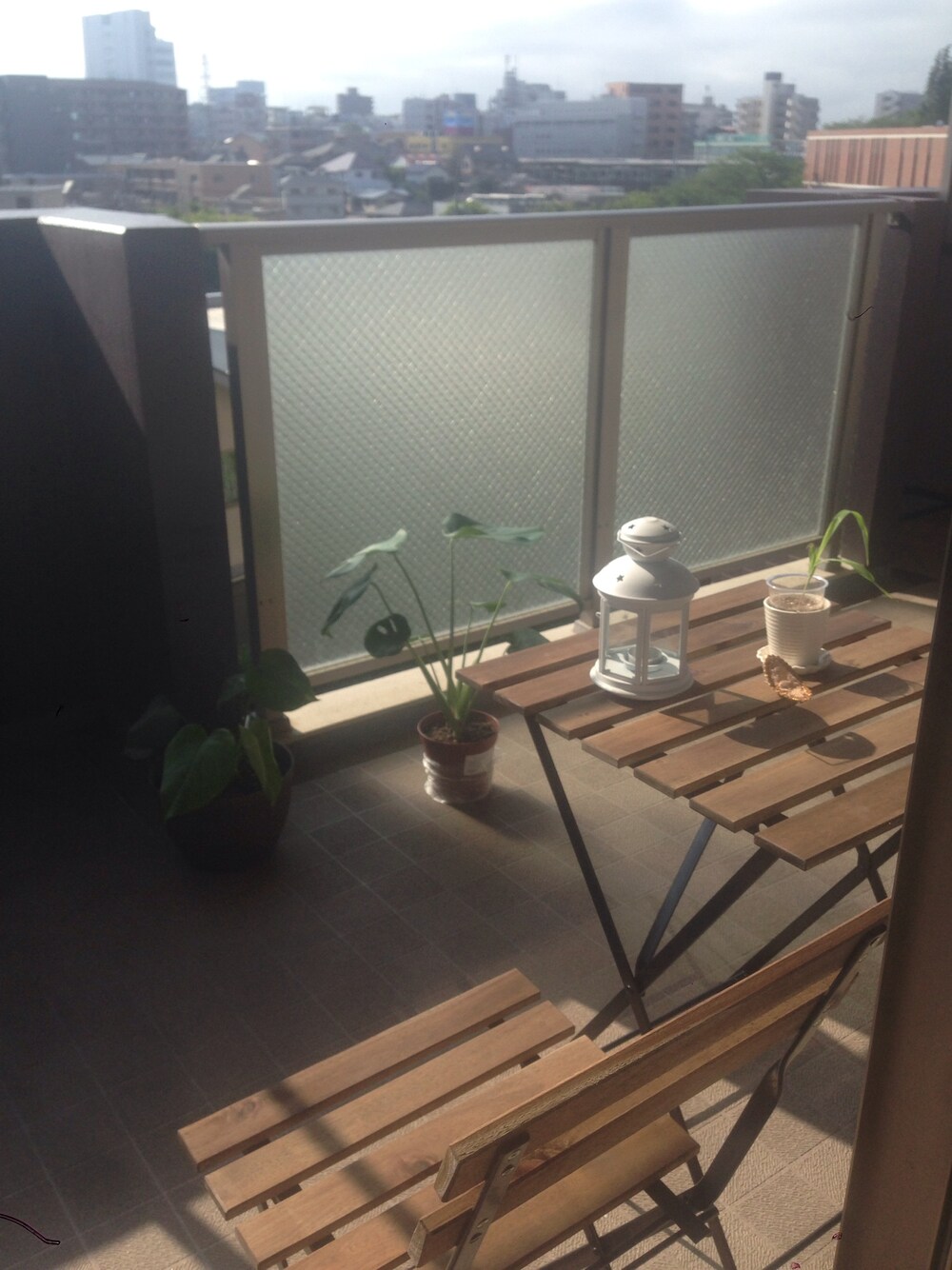 テーブル、イス、ランプ、葉っぱ、 全てIKEAで調達(=^x^=) 部屋撮りじゃなくて、 ベランダ撮り(≧∇≦) ここで、珈琲を飲む( ´ ▽ ` )ノ 余裕の朝だけ、、、