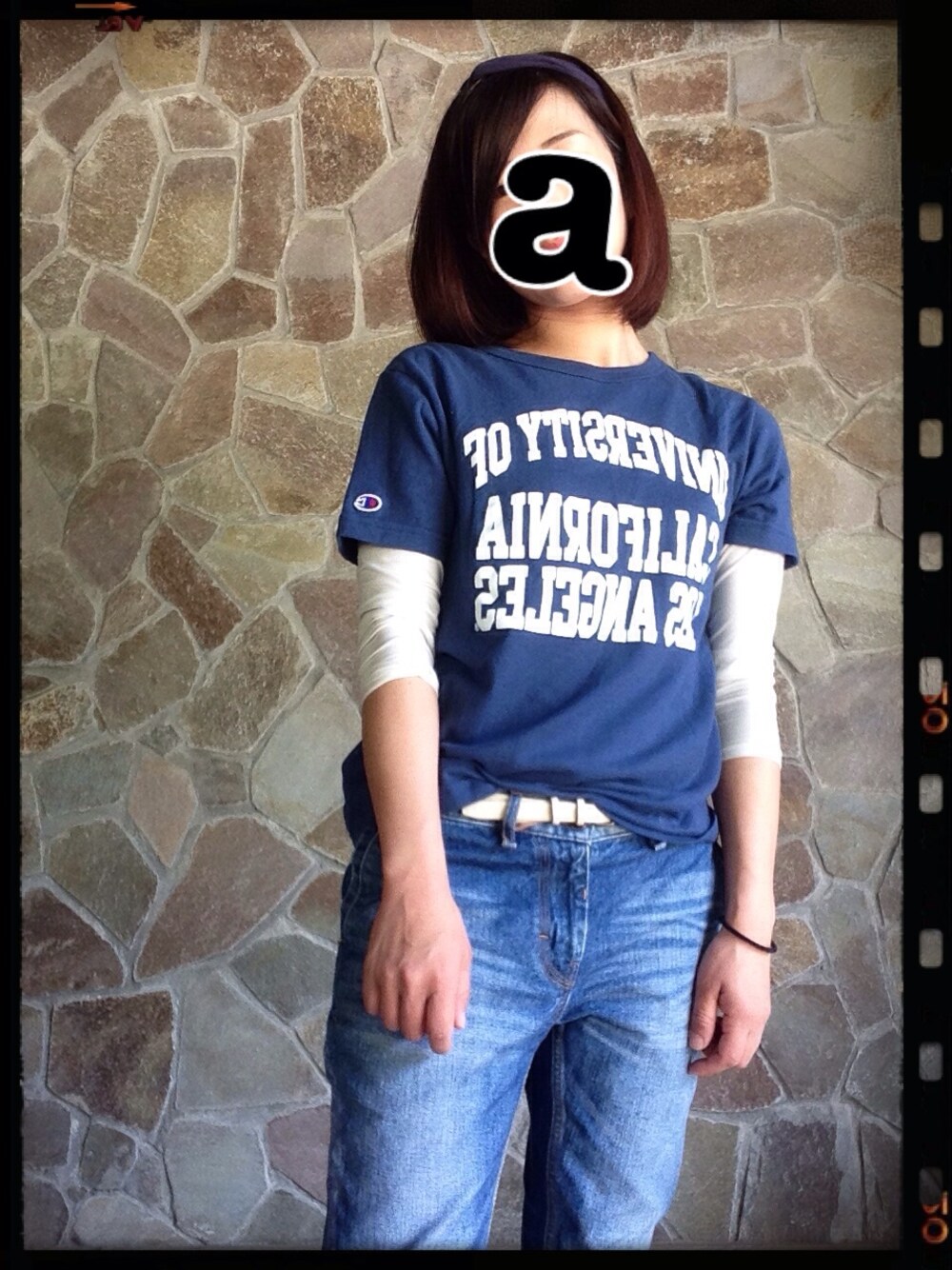Tシャツ、チャンピョン 本当はスカートとかで合わせたい。 けどお仕事なので(´・Д・)」