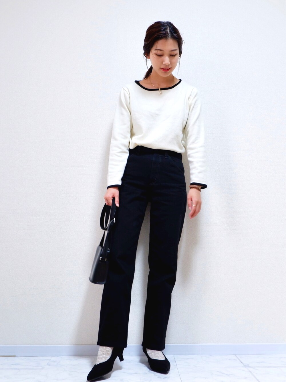 simple🤍 白黒モノトーン好き♩ アクセにパールを合わせて上品に☺︎